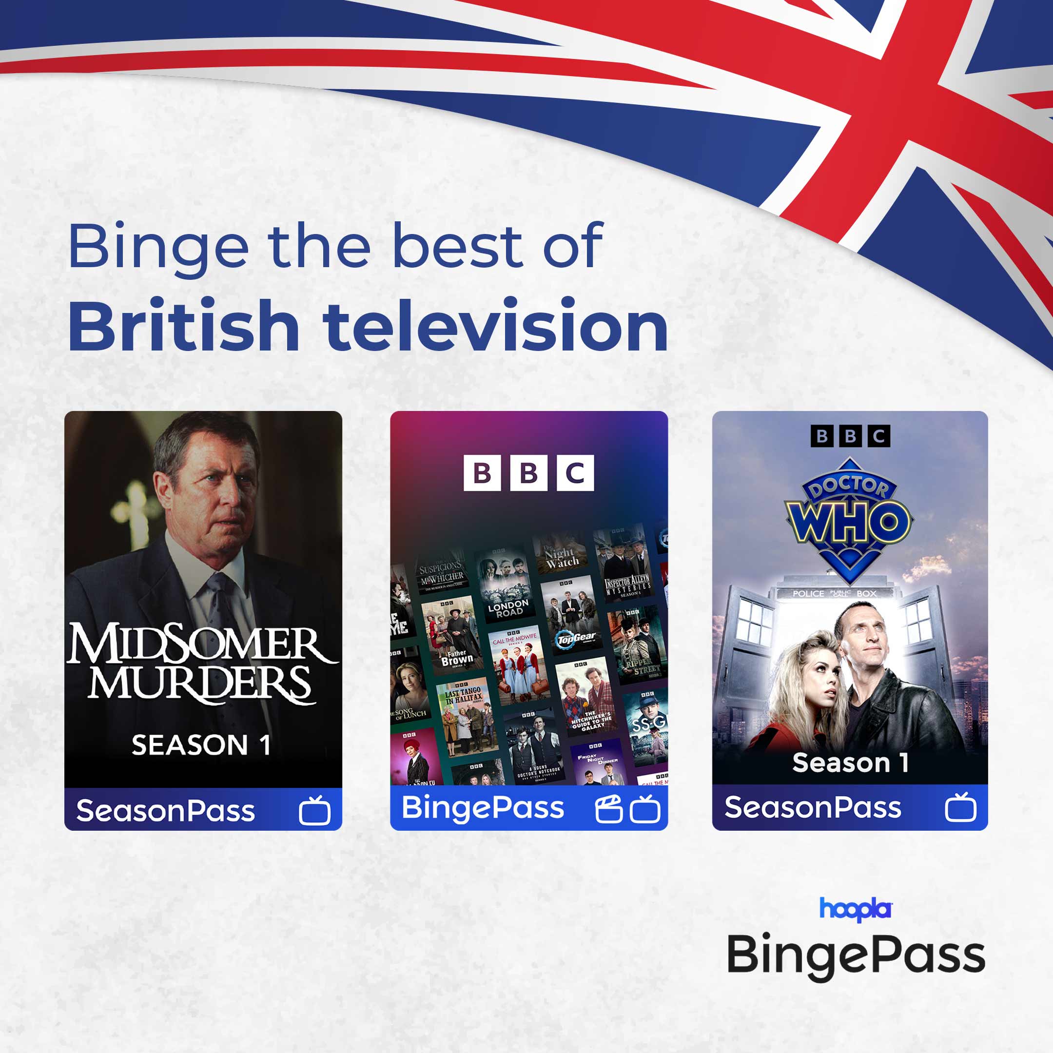 Patrons can feed their craving for British television with this British Binge Collection featuring the BBC BingePass, SeasonPasses, and more. Get access to variety of British series or a full season of a show for seven days.