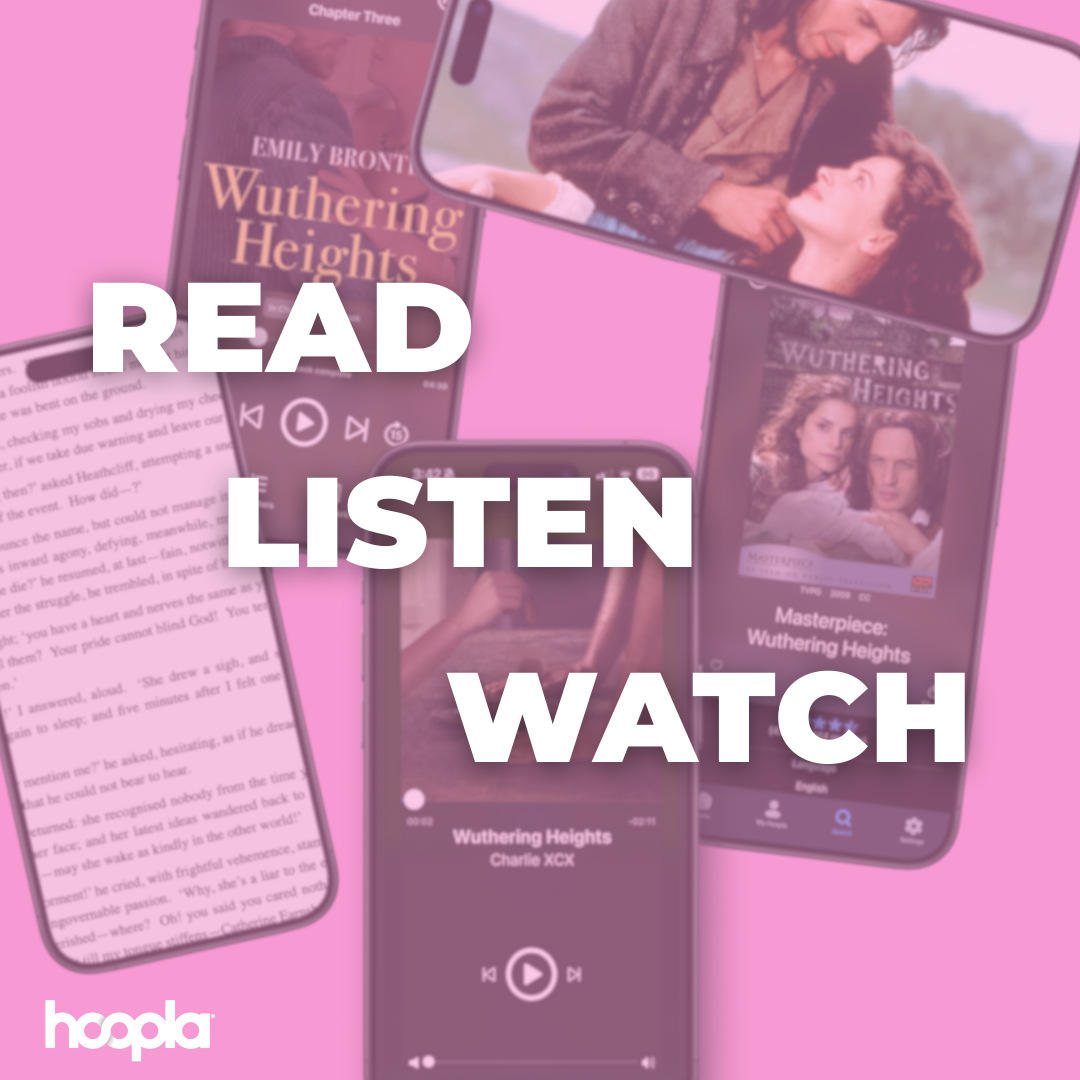In anticipation for the new Wuthering Heights movie adaptation, patrons can read, listen, and watch various version and adaptations of Emily Brontë's Wuthering Heights with this Hoopla collection. Below you can find a Facebook asset and assets for an Instagram carousel.