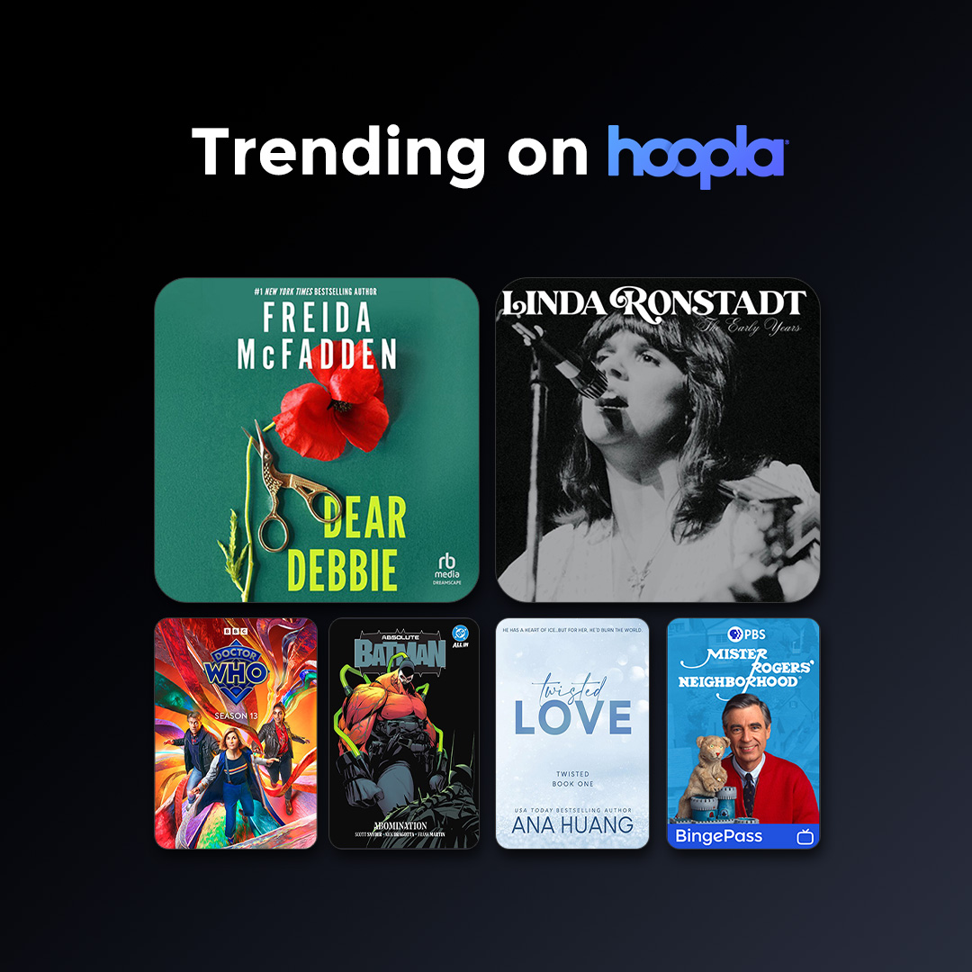 Trending in March! Share what titles are new and trending on Hoopla across all formats: audiobooks, eBooks, comics and manga, music, movies and TV, and BingePass with these assets! This collection and assets can be used instead of the format specific ones, or in addition
