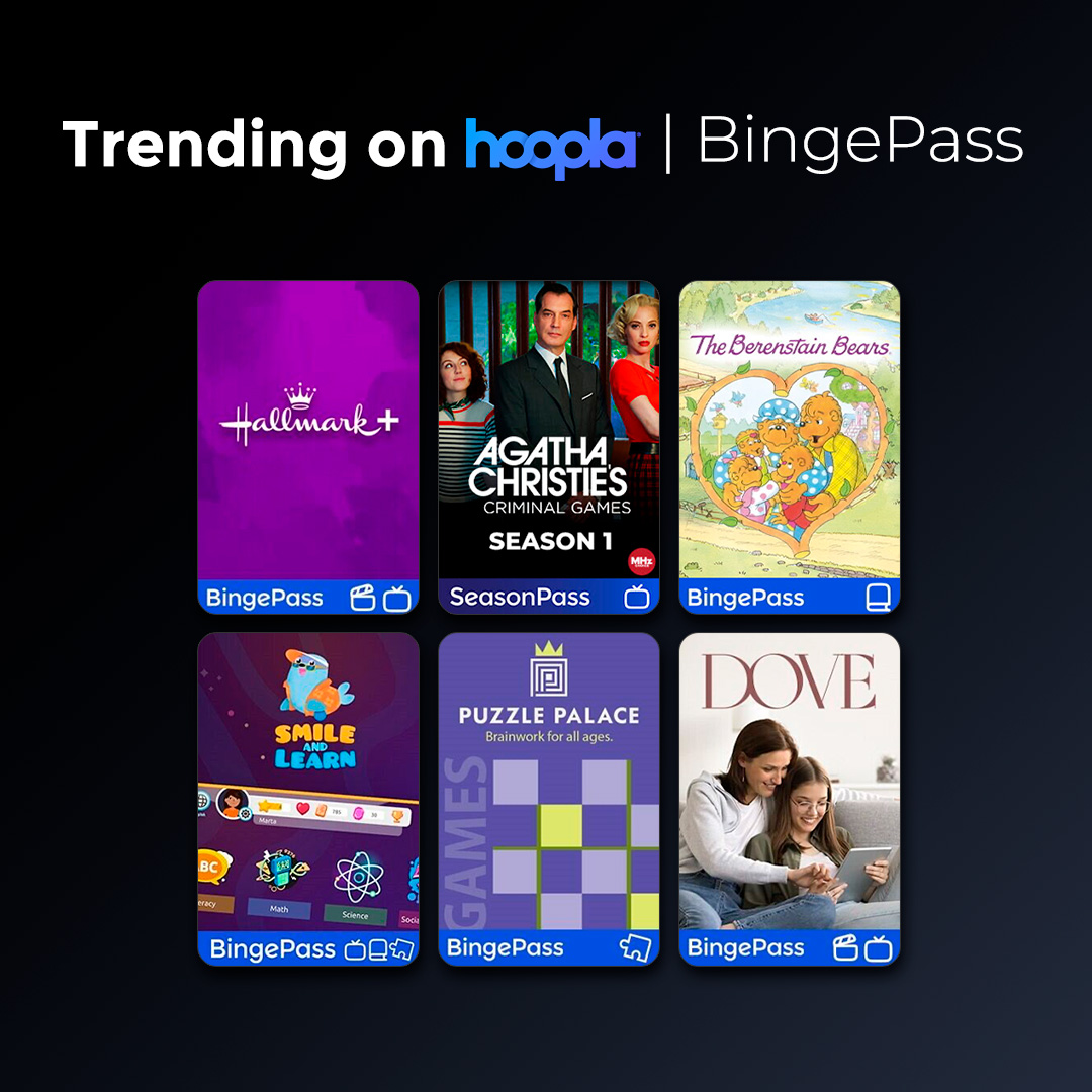 Trending in December! BingePass is now included in Trending on Hoopla! Patrons can check out which BingePasses and SeasonPasses are trending with users on Hoopla and try it out for themselves.