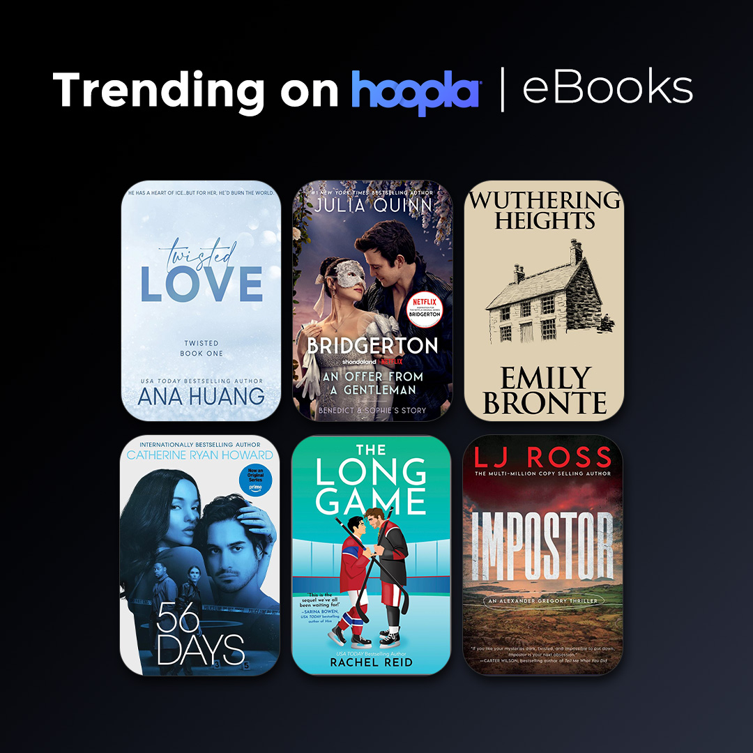 Trending in March! Let your patrons know what eBooks are new and trending on Hoopla this month by posting these assets on your social media. Combine with audiobooks or other format assets, or promote the eBooks collection by itself.
